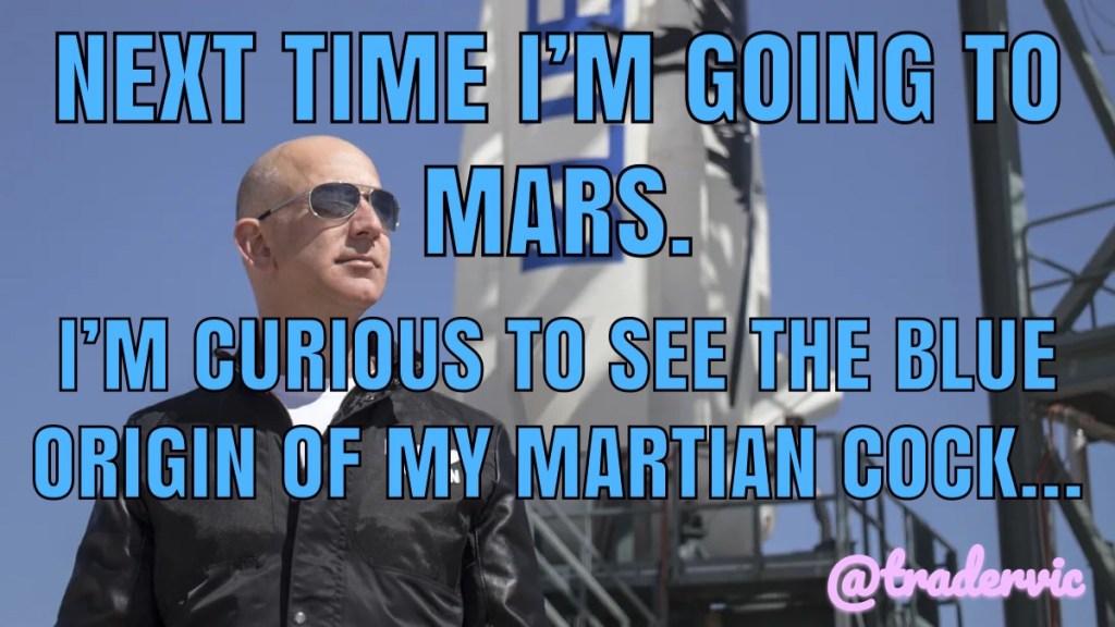 Reasons for Space Travel Posted by..papichuloJuly 21, 2021Posted inFinanceTags:AMZN, Blue Origin, douchebag, Mars, meme, Space Travel Share this:Share Share on X (Opens in new window) X Share on Facebook (Opens in new window) Facebook Share on LinkedIn (Opens in new window) LinkedIn Share on Telegram (Opens in new window) Telegram Share on WhatsApp (Opens in new window) WhatsApp Email a link to a friend (Opens in new window) Email Like Loading... Published by ..papichulo Trader View more posts
